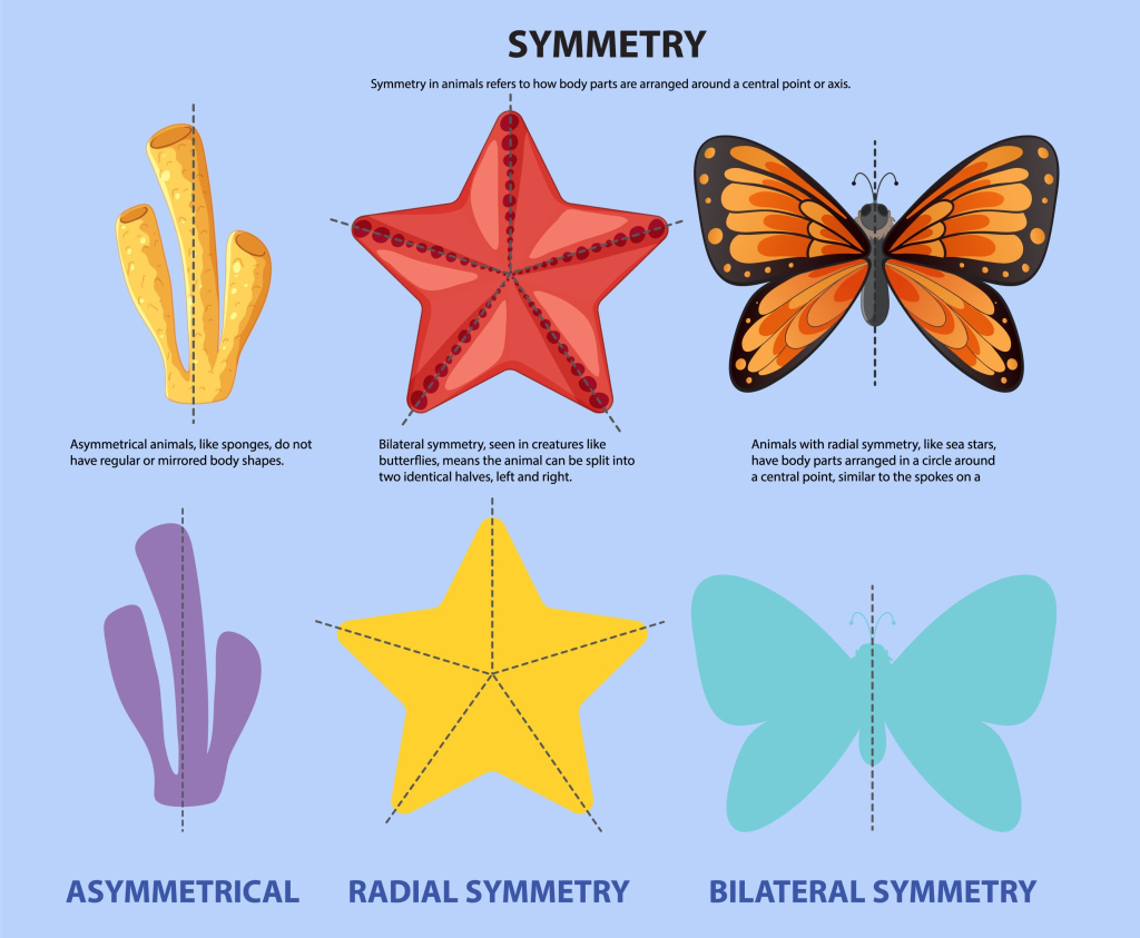 - Asymmetrical: Cannot be divided into equal halves (e.g., Sponges).